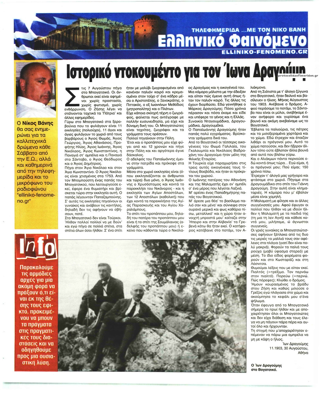 ΕΛΕΥΘΕΡΗ ΩΡΑ Ίων Δραγούμης στο Βογατσικό,Το σπίτι του προπάππου μου,δηλαδή του πατέρα του προπάππου μου είναι ή το σπίτι του Σουμάλαινας (αδελφής του προπάππου μου) ή εκείνο που κάθονται τώρα ο Νικόλαος Δραγόμας και η οικογένειά του. 7 Αυγούστου 1903: