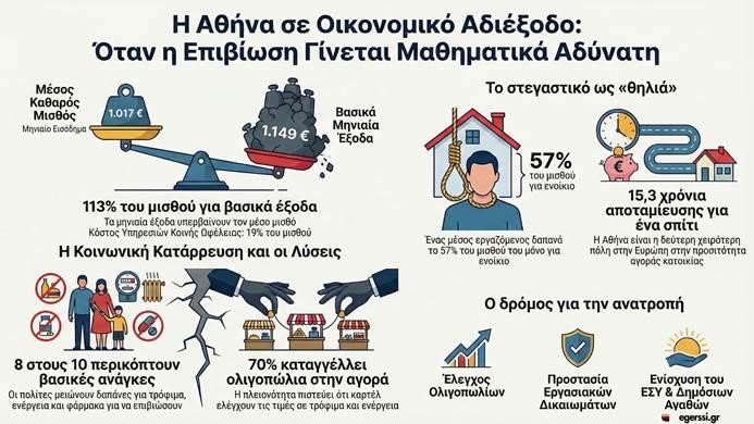 Η Αθήνα μεταμορφώθηκε σε πεδίο κοινωνικής εξόντωσης. Σύμφωνα με την Tradingpedia, τα βασικά έξοδα διαβίωσης αντιστοιχούν στο 113% του μέσου μισθού – με άλλα λόγια, ακόμα κι αν δουλεύεις και ξοδέψεις όλο σου το μισθό, χρωστάς ήδη 132 ευρώ την 1η του μήνα. Αυτή είναι η πραγματικότητα που η κυβέρνηση επιμένει να αποκρύπτει πίσω από τα φωτογενή στοιχεία τουρισμού και τις προπαγανδιστικές καμπάνιες για την «επιτυχημένη Ελλάδα».