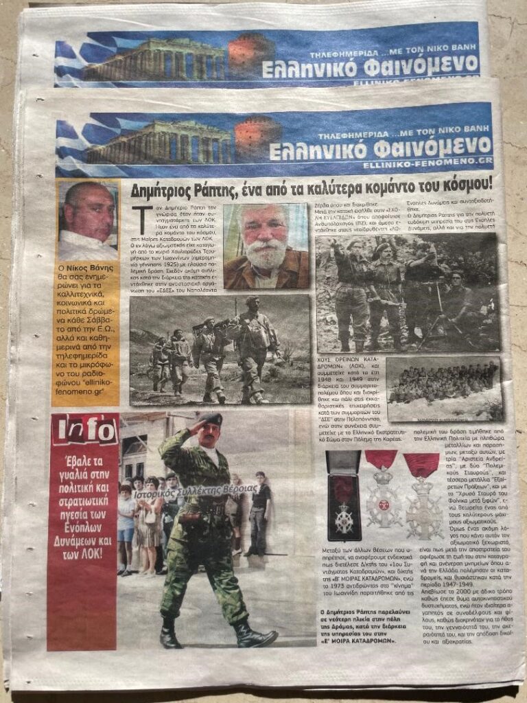 Οπισθόφυλλο και πρωτοσέλιδο στην εφημερίδας Ελεύθερη Ώρα και του Ελληνικό Φαινόμενο. elliniko-fenomeno.gr-31-1-2026-Το κομάντο Ο ΔΗΜΗΤΡΙΟΣ ΡΑΠΤΗΣ που έβαλε τα γυαλιά στην πολιτική και στρατιωτική ηγεσία των Ενόπλων Δυνάμεων και ΣΤΑ ΛΟΚ.