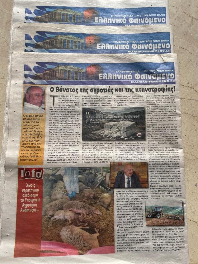 Οπισθόφυλλο και πρωτοσέλιδο στην εφημερίδας Ελεύθερη Ώρα και του Ελληνικό Φαινόμενο. elliniko-fenomeno.gr-21-1-2026-ΤΟ Υπουργείο Αγροτικής Ανάπτυξης και Τροφίμων Χωρίς Σχεδιασμό στην γεωργική και ΤΗΝ – Κτηνοτροφική πολιτική…