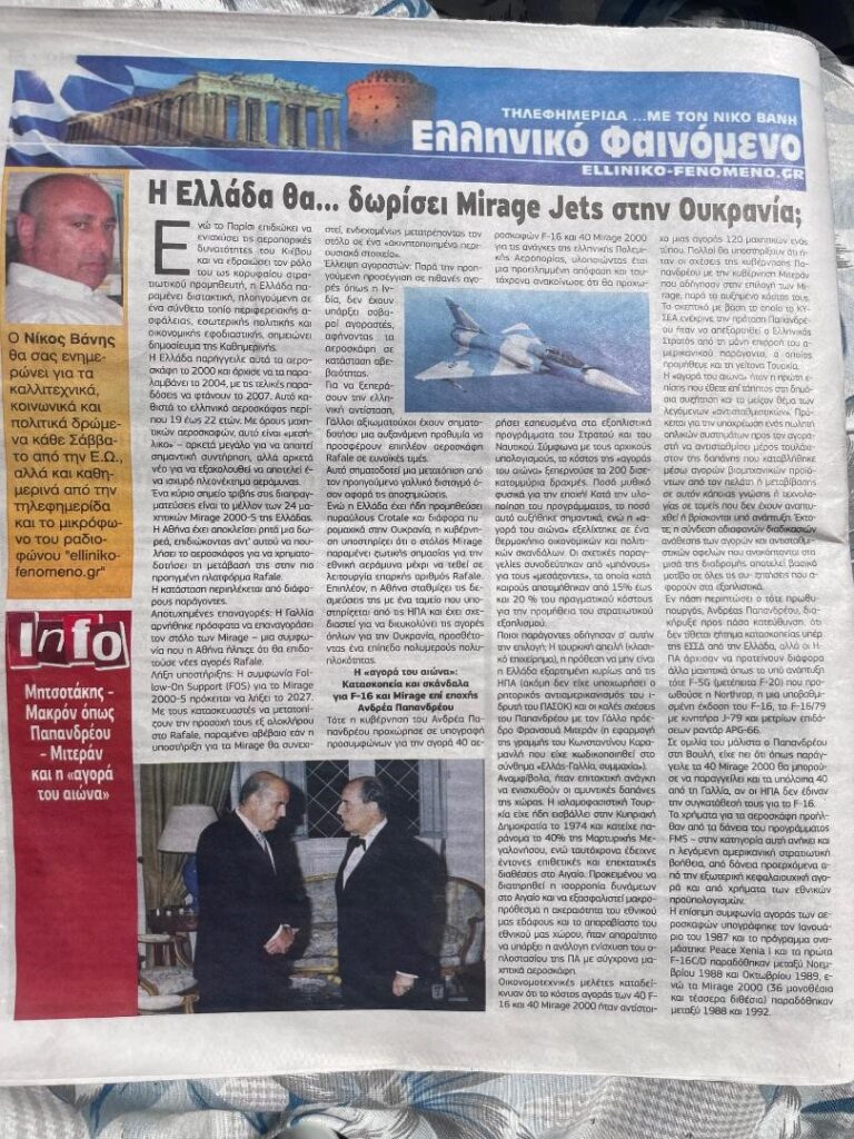 Οπισθόφυλλο και πρωτοσέλιδο στην εφημερίδας Ελεύθερη Ώρα και του Ελληνικό Φαινόμενο. elliniko-fenomeno.gr-31-4-2026-Η Ελλάδα δωρίσει Mirage Jets στην Ουκρανία?? Για Την αγορά 40 Mirage Jets..