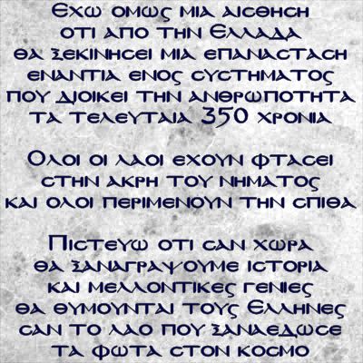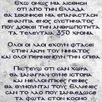 – Ούτως ή άλλως σκλαβωμένοι, φτωχοί, και δούλοι στη παγκόσμια Σιωνιστική Δικτατορία θα ζήσουμε από δώ και μπρός, και εμείς και οι ερχόμενες γενεές Ελλήνων. Είναι επαναστατική πράξη, που θυμίζει το έπος του 1821