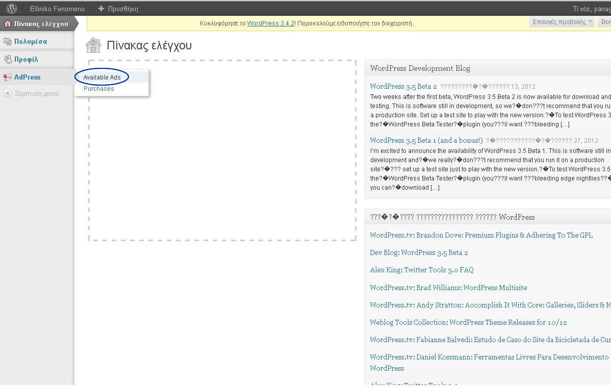 Αφού συνδεθείτε στο σύστημα, από το μενού αριστερά επιλέξτε AdPress και στη συνέχεια Available Ads.